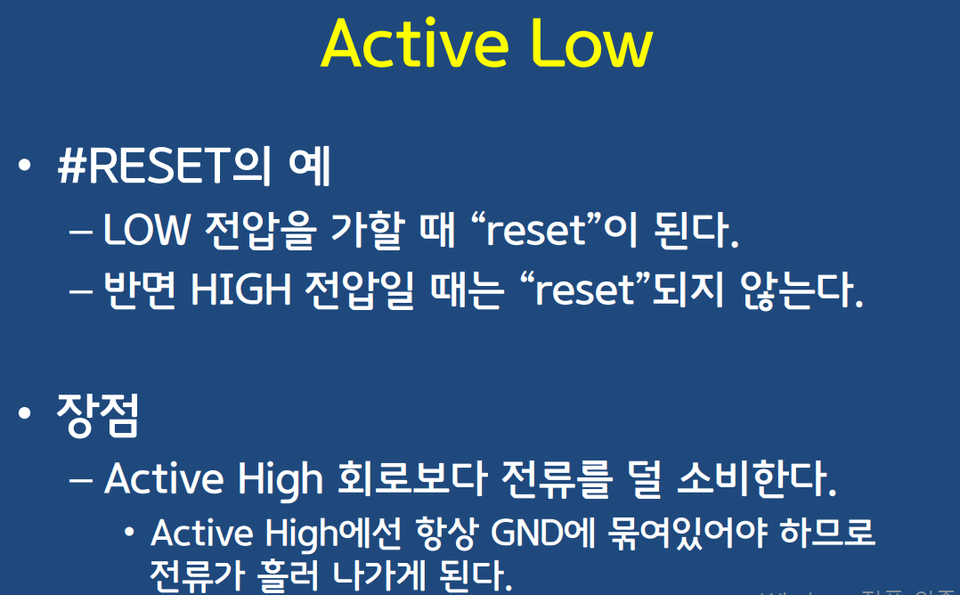 만약 reset이 active high로 동작한다면 어떻게 될까요? 갑작스런 정전기와 같은 외부 요인에 의해 동작 중에 reset신호 가 활성화 된다면... 끔찍하죠... 따라서 reset과 같은 신호는 외부 노이즈에 의해 활성화 되지 않도록 active low를 사용합 니다. 또 다른 예시로는 memory chip select신호와 write enable 등도 있죠. Memory의 데이터는 중요하기 때문에 함부로 read/write동작이 이루어져서는 안됩니다. 따라서 외부 노이즈에 의해 memory에서 데이터를 읽거나, 노이즈를 쓰지 않게 하기 위해 active low를 사용하기도 합니다.