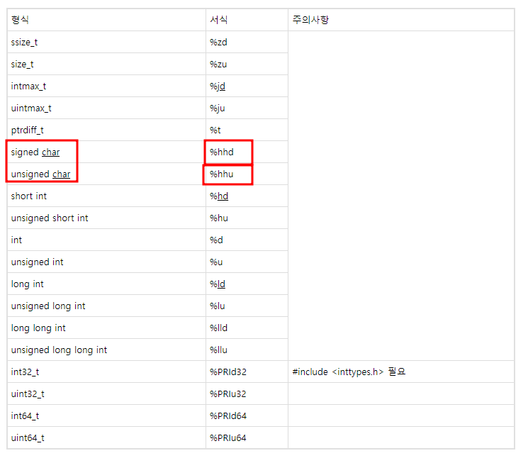 %hhd 👉 signed char. 즉 1byte(8bit) 로 표현한 정수를 출력하고자 할 때.